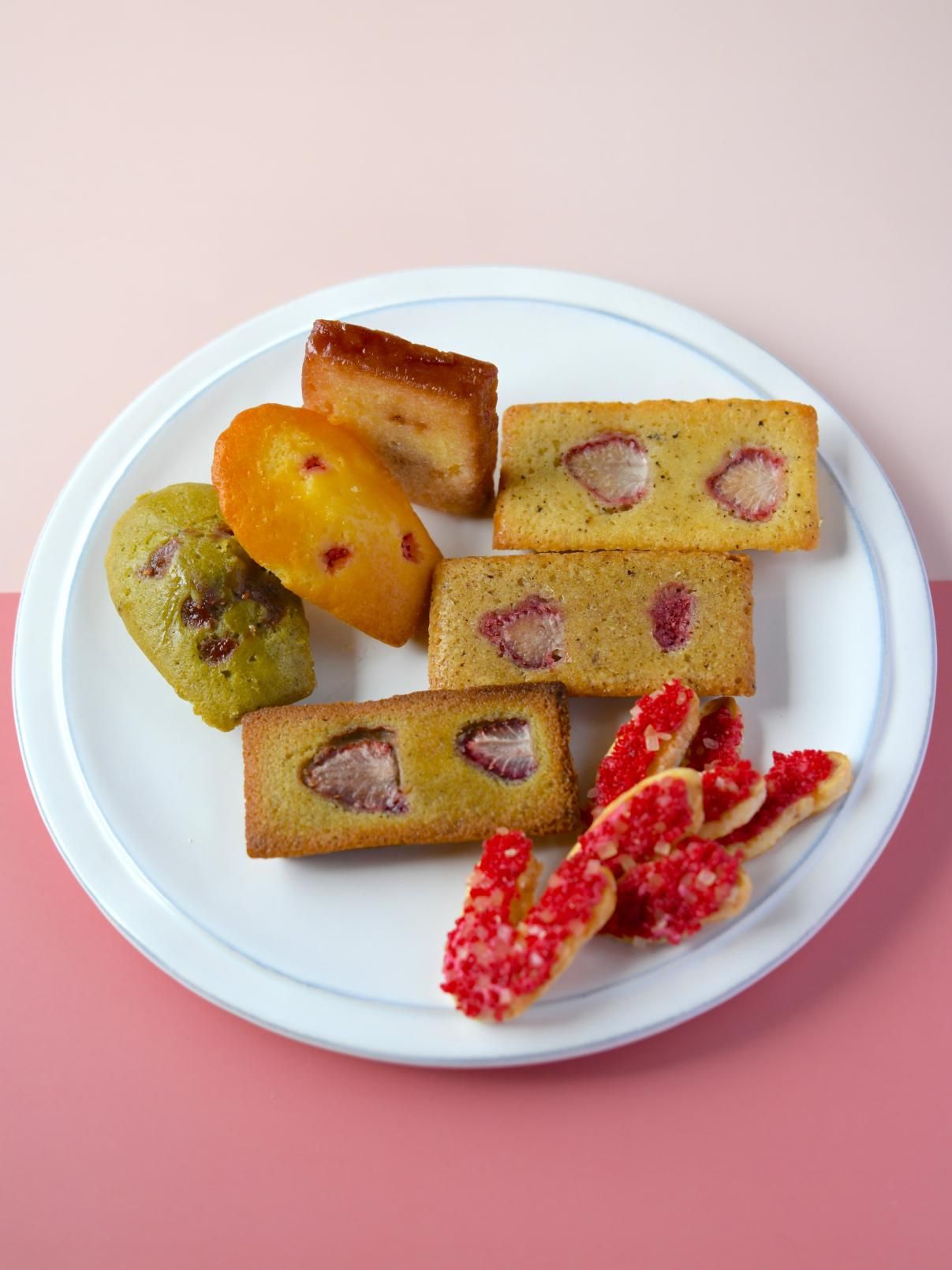 - 苺のフィナンシェ(アーモンド)・苺とヘーゼルナッツのフィナンシェ・苺とピスタチオのフィナンシェ・苺のマドレーヌ・木苺のピスタチオマドレーヌ・レモンとフランボワーズのパウンドケーキ(カット)各1個、木苺のパルミエ2個入×1袋